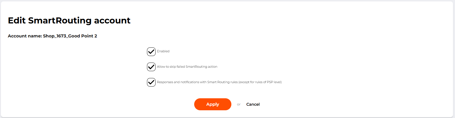 The service activation option is available to a PSP employee with the Account manager role. To enable the service, on the shop editing page click on the Smart Routing account tab.