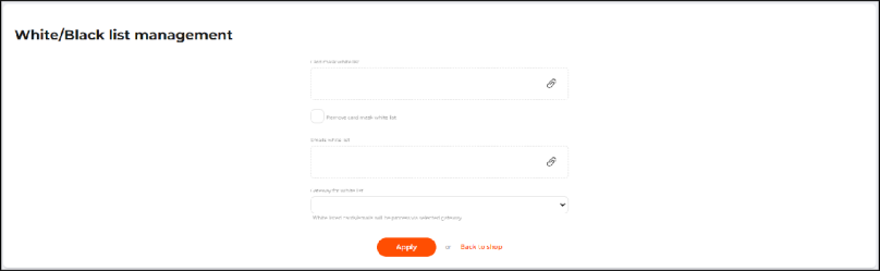 The uploaded credit card mask or email list is added as a white list for the selected payment gateway. With no gateway picked, the transactions will be processed through any of the gateways activated for the shop.