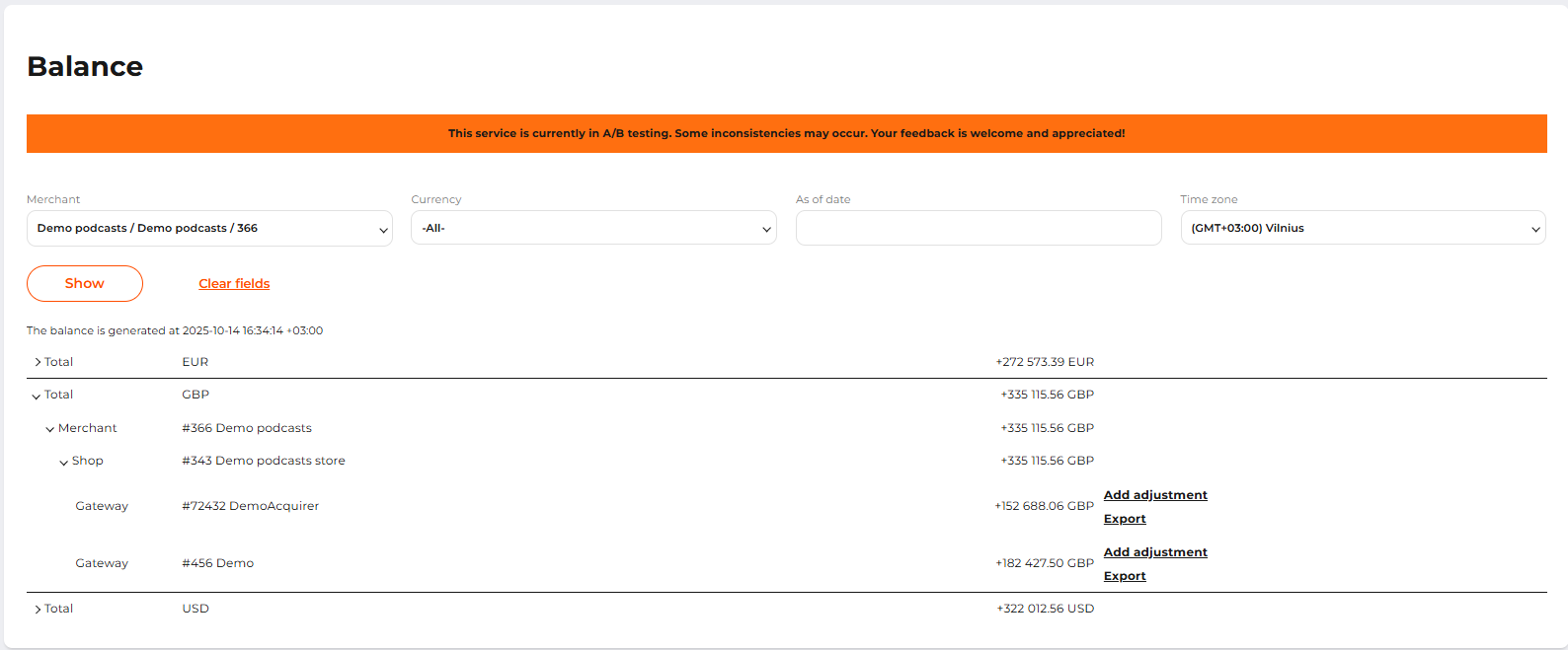 The Balance page displays the balances by merchants, merchant shops and shop gateways. The page also lets you adjust the balance for the selected shop gateway and export it in CSV format.