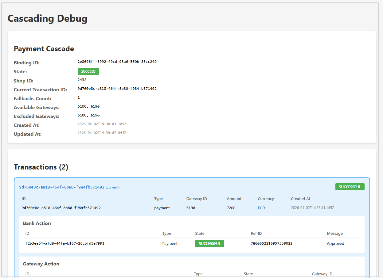 In the back office, there will be information on all transaction attempts. Additionally, for users with the Support manager role on the transaction details page for all transactions processed using the Cascading payments h2h service there will be an additional transaction identifier – Binding ID.