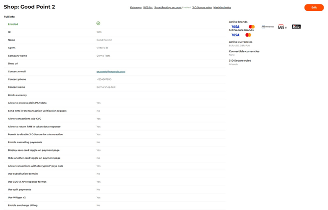 You can see the enabled brands on the shop settings page. Even if Apple Pay, Google Pay, or Samsung Pay checkboxes are cleared, the transactions using the tokens by these token providers can still be processed in the system. This setting only controls whether the corresponding payment methods are displayed on the payment widget. |