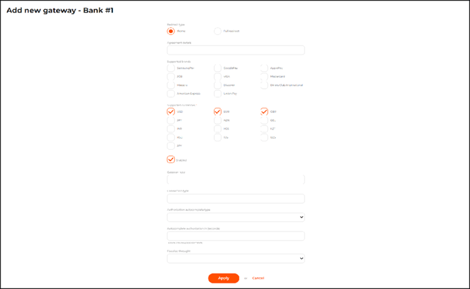 Checkboxes to activate required currencies used for payment processing. Possible values depend on the payment gateway configuration. |