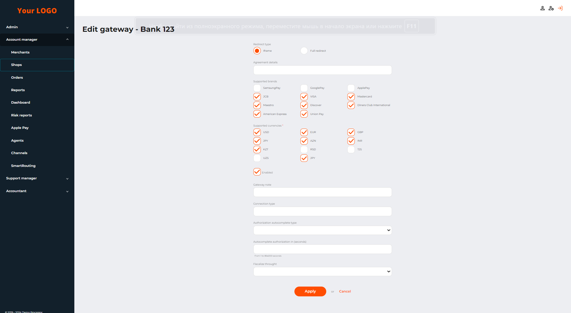 To enable the Apple Pay service for a merchant’s shop, follow the steps below: