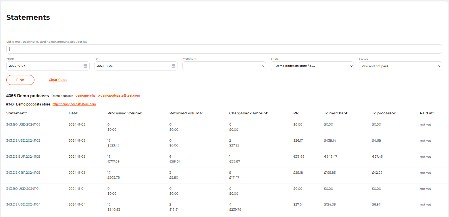 A statement status. Possible values: Paid and not paid: to show statements of all statuses; Only paid: to show the paid statements. Only not paid: to show statements that are not paid yet. |