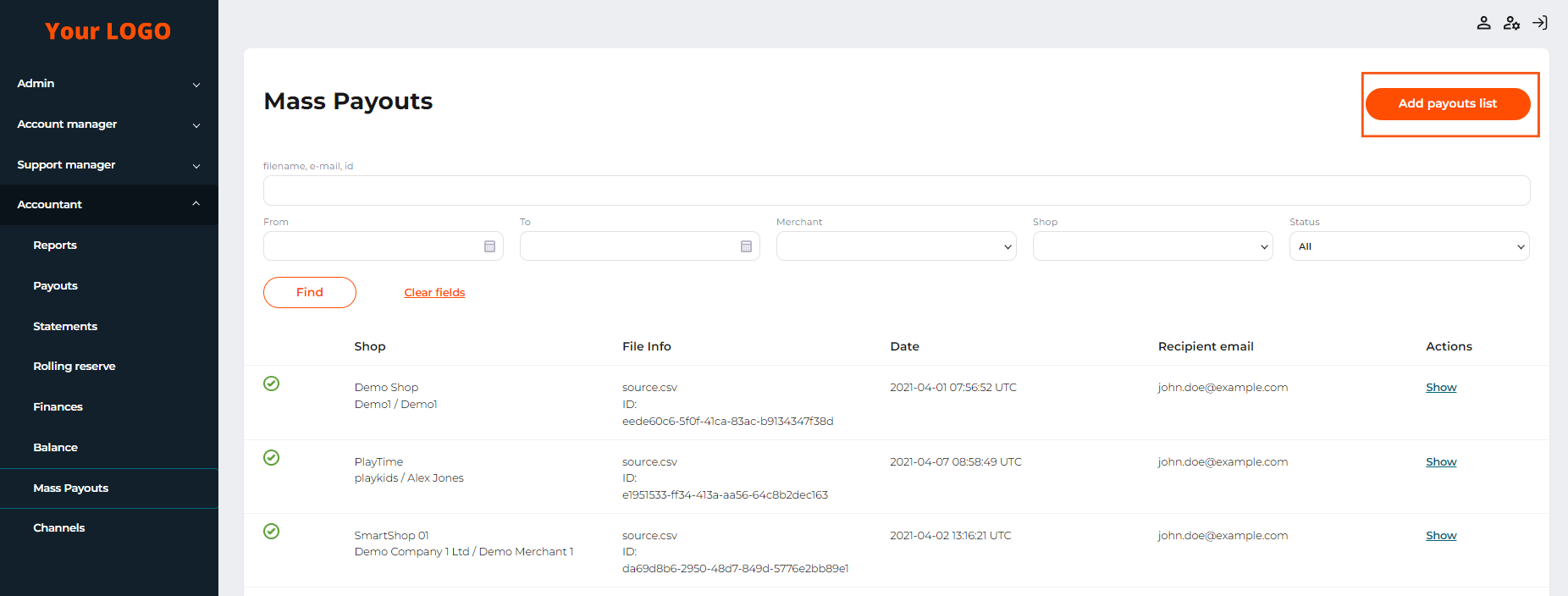 As soon as all the payouts are made, a report on the results of payouts will be sent to the specified user email. For more information on the file format, see Report file on a mass payout.