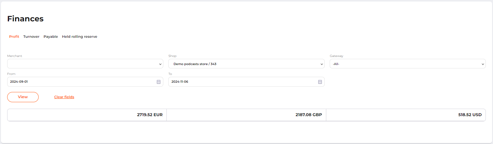 The display pane will show profit amounts for each active currency of the payment gateways enabled for the selected merchant’s shop.
