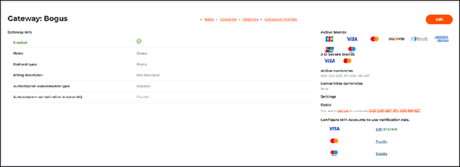 - Active currencies. A section of supported currencies, transactions in which can be processed by the payment gateway.
