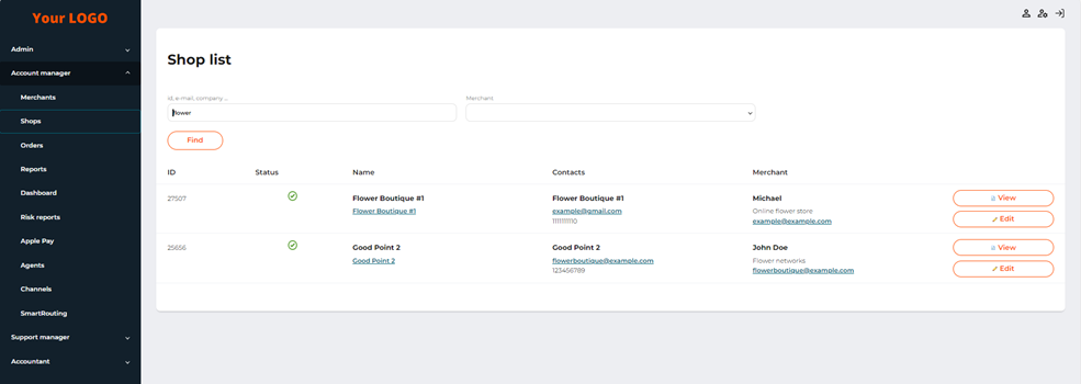 To see a list of merchant shops registered in the system, go to Account Manager > Shops.