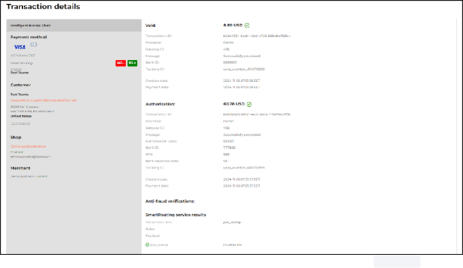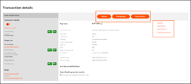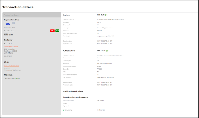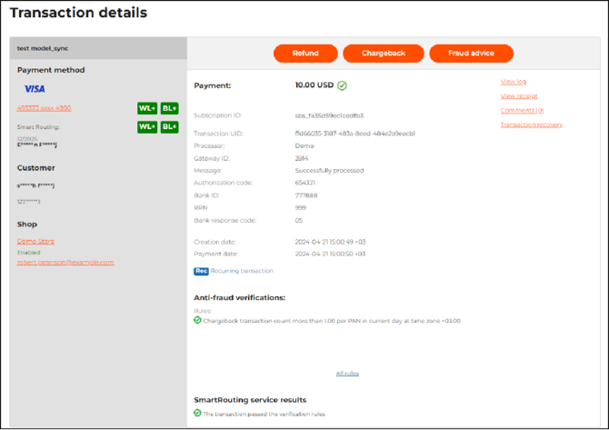 Transaction details page: according to SmartRouting service results, the transaction card hash ( pm_stamp ) is in the whitelist.