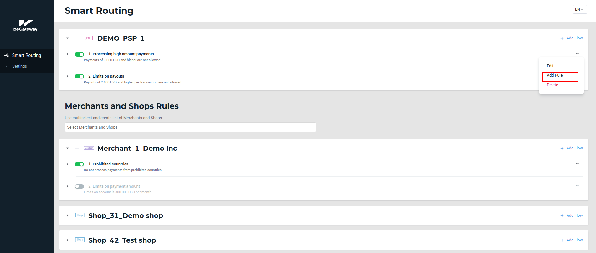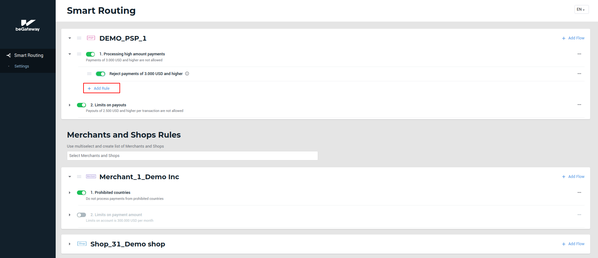 The ordinal number of the rule in a queue of rules. When processing a transaction, the Smart Routing service runs checking against flows and rules according to their priority set by the user. Only active flows and rules are applicable. When a rule is created, the next ordinal number applies by default. Further on, you can edit it. |