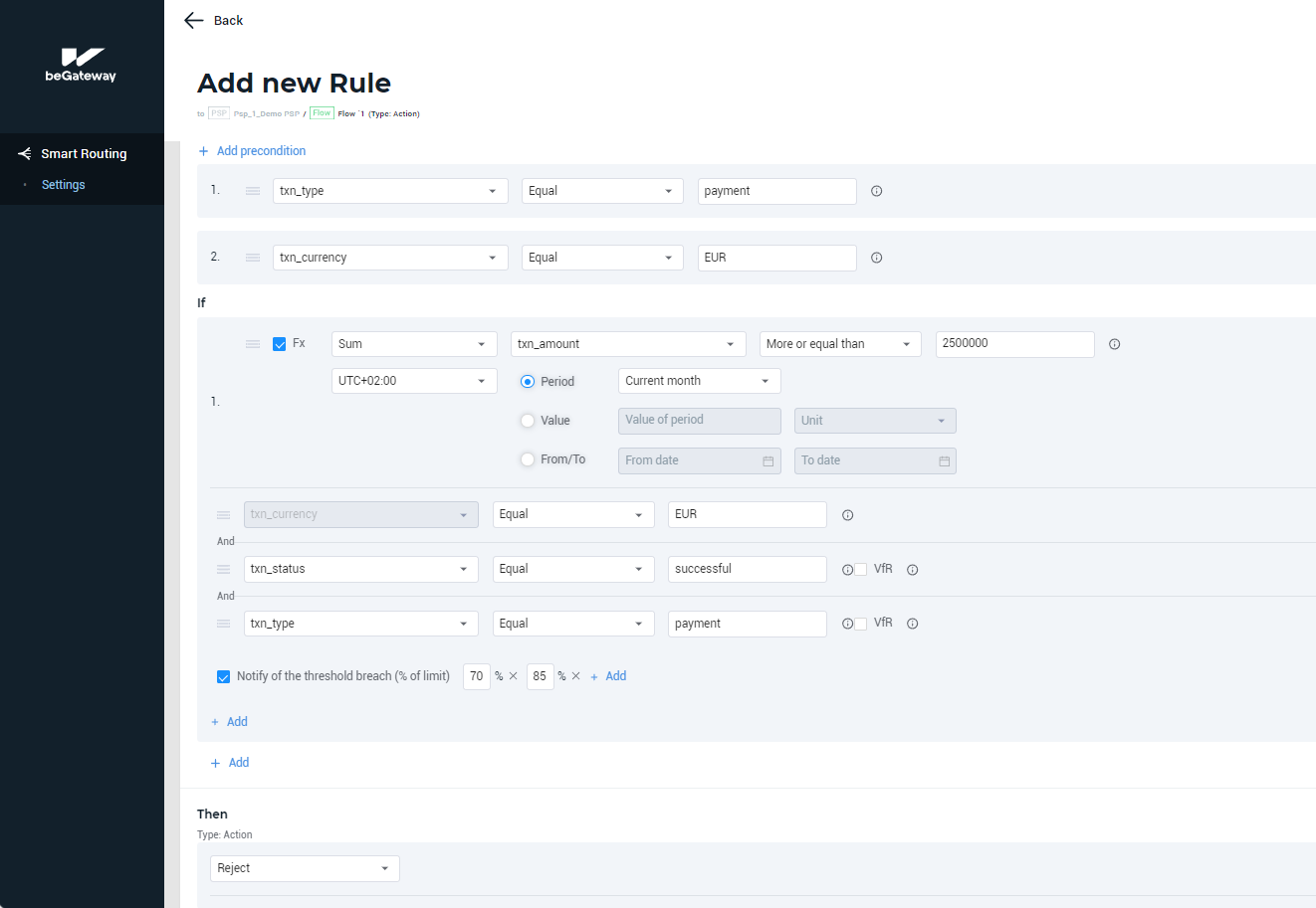 If the condition in the Preconditions block is not met, the check against the corresponding rule is not performed, thus decreasing the time required for Smart Routing checks. |