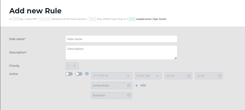 Time zone, according to which the dates and time of the rule activation/deactivation will be applied. By default, UTC + 00:00 |