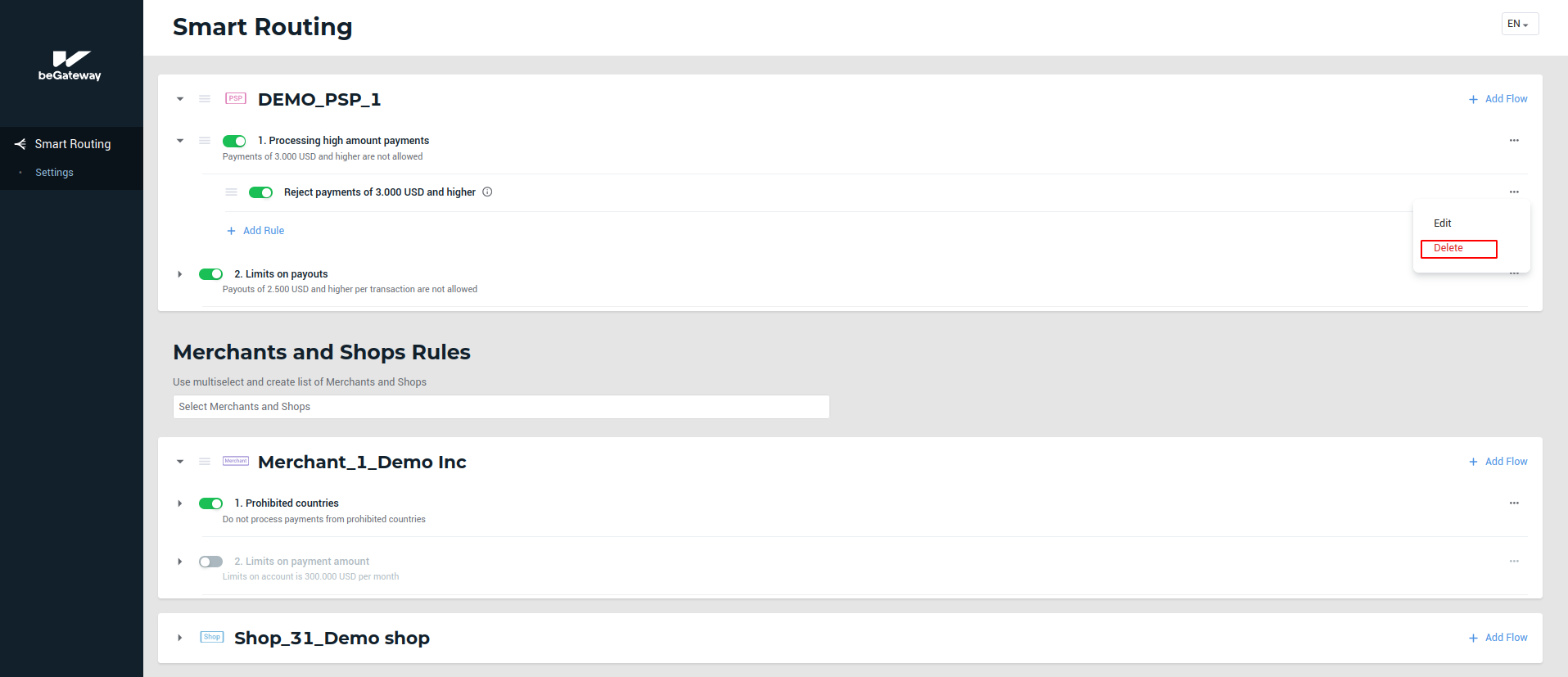 Delete a rule The service allows you to delete any rules. Follow the steps below: Go to the Smart Routing tab. Select Delete in the rule menu. The Delete button in the rule menu Instead of deleting a rule, you can deactivate it. For that, use the toggle next to the rule name.