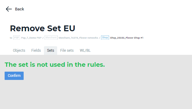 Clicking Delete will redirect you to the Remove Set page. If the set is not used in the rule(-s), the corresponding message will be displayed. Click Confirm to complete the set deletion.