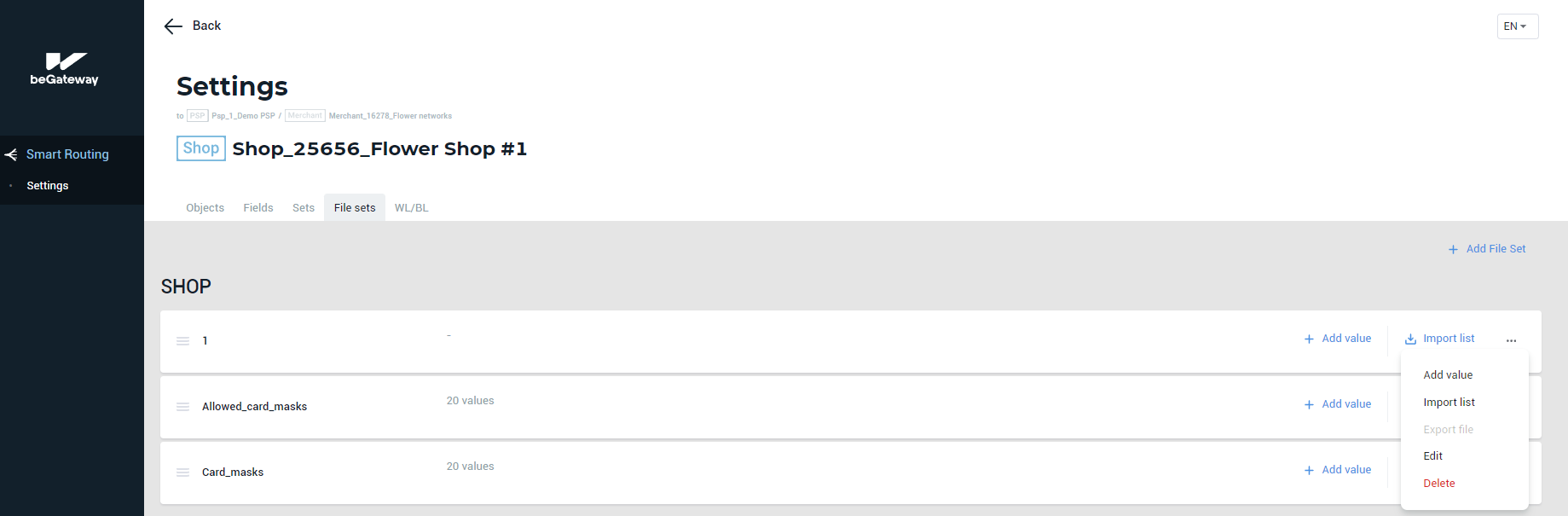 To add multiple values, use Import list option by selecting the corresponding command in the File set menu or by clicking Import list in the corresponding File Set line.