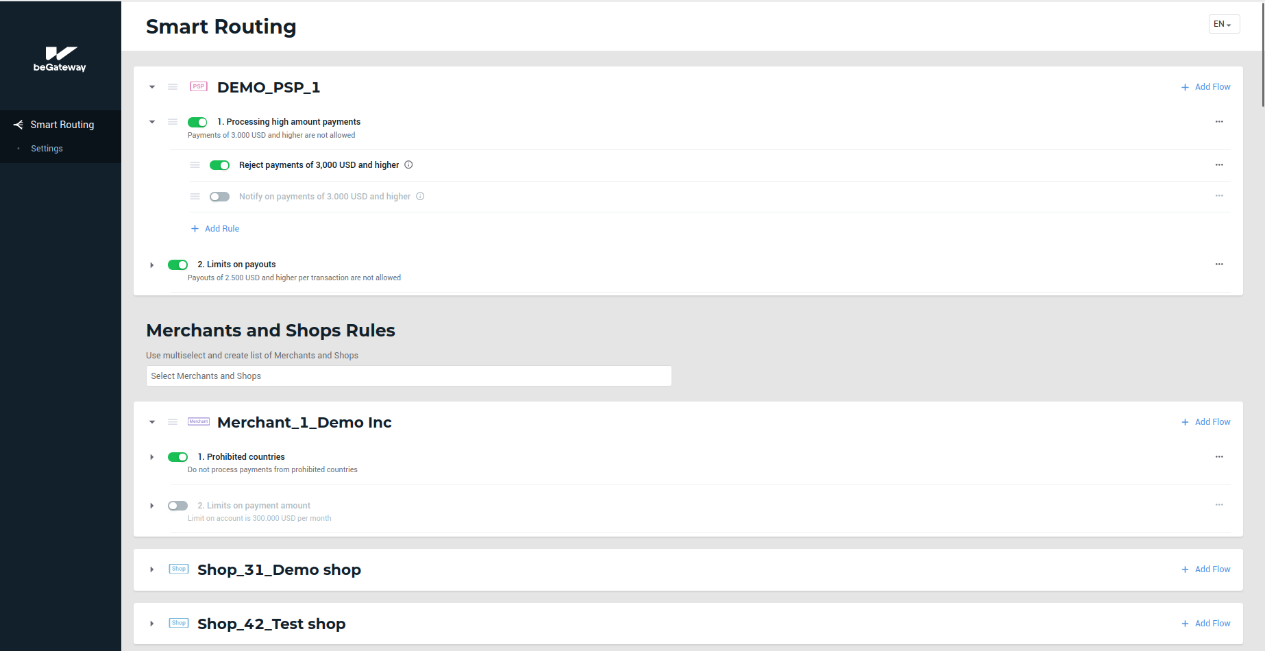 The list of rules of the “Processing high amount payments” for the DEMO_PSP_1 account