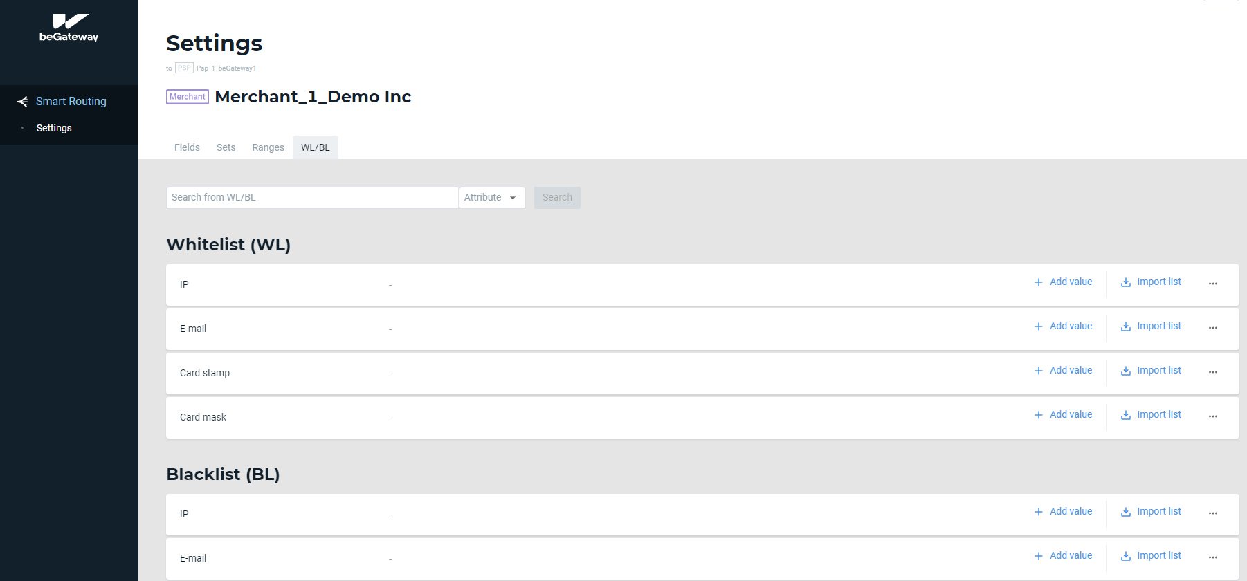 View whitelists/blacklists To view the applicable whitelists and blacklists, go to the WL/BL tab. To navigate the list, use the search field: insert the exact attribute value in the search field, select the attribute type in the drop-down menu and click Search.