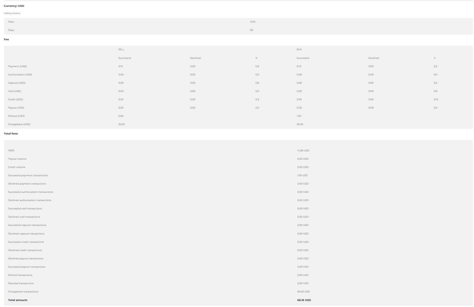 Successful: a fixed amount taken per each successful Payout transaction. Declined: a fixed amount taken per each declined Payout transaction. %: a percentage of the transaction amount taken per each successful Payout transaction. |