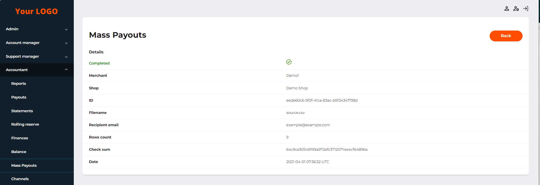The page that opens displays detailed information about a mass payout, as described in the table below.