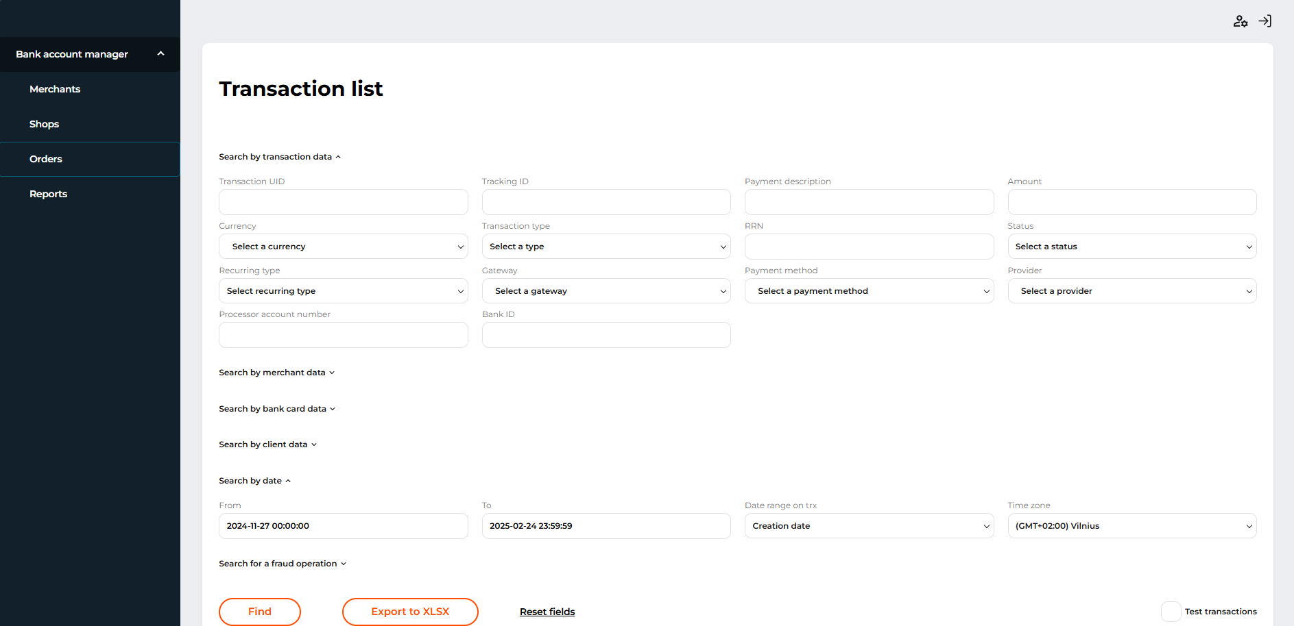 | Отчёты | Получение отчётов с данными транзакций, сортировка по критериям, экспорт отчётов по обработанным транзакциям. Можно ограничить шлюзы, информация по которым будет доступна пользователю в этом разделе. |