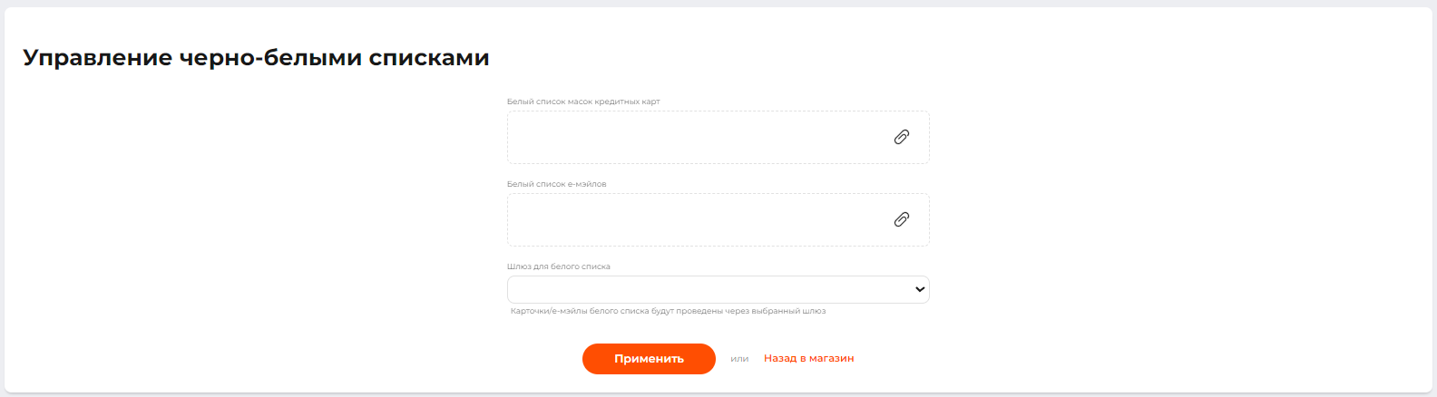 Список масок карт или адресов электронной почты будет добавлен как “белый” список для выбранного шлюза. Если шлюз не выбран, транзакции будут обрабатываться через любой другой шлюз, активированный для магазина.