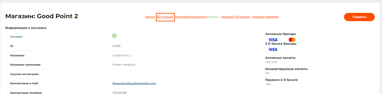 - Найдите нужный магазин, для платежного шлюза которого хотите добавить “белый” список данных клиентов.