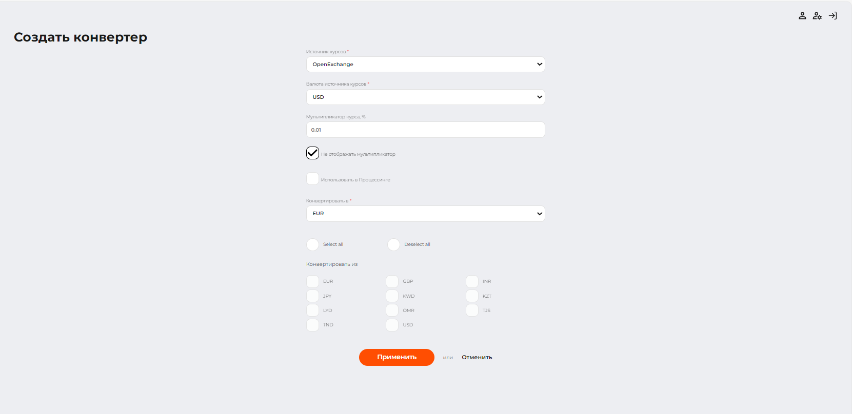 Если опция Использовать в Процессинге активирована, список целевых валют будет совпадать с валютами шлюза. Если опция Использовать в Процессинге отключена, то список целевых валют определяется валютами, доступными в выбранном источнике курсов. |
