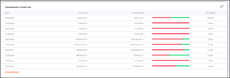 Данная диаграмма показывает сумму и количество успешных и отклоненных транзакций в выбранной валюте, сгруппированных по дням в рамках выбранного пользователем периода, а также конверсию (процентное отношение количества успешных транзакций к общему количеству успешных и отклоненных транзакций).