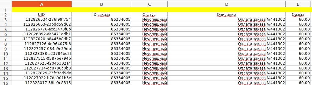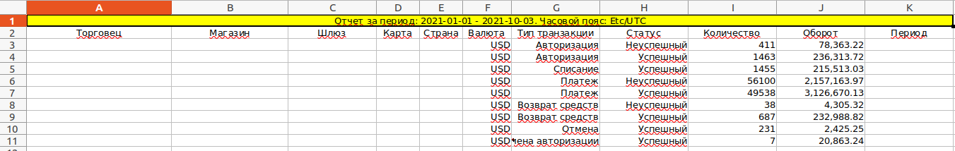 Отчет формата XLSX может содержать одну или более вкладок с данными в колонках в зависимости от того, какие параметры отчета были указаны и была ли запрошена страница транзакций.