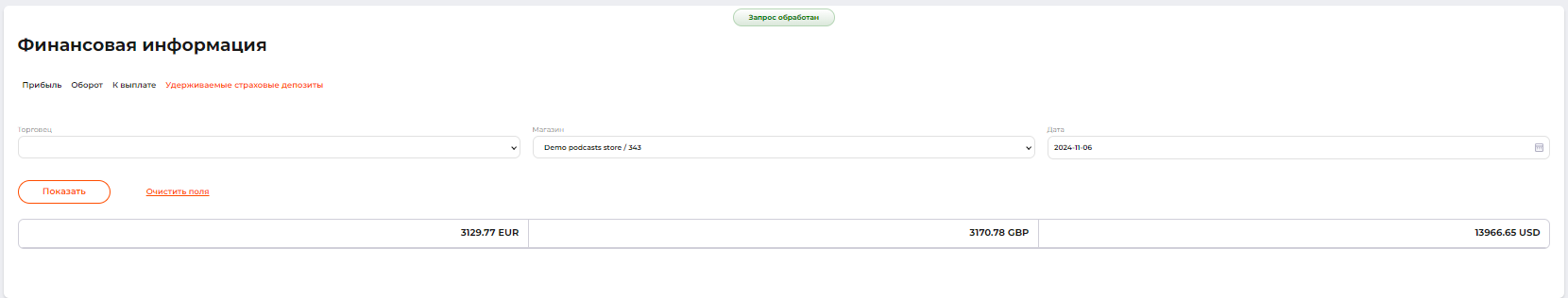 Система позволяет рассчитать сумму невозвращенных страховых депозитов торговцу на указанную дату, если к транзакциям торговца применялось удержание страхового депозита.