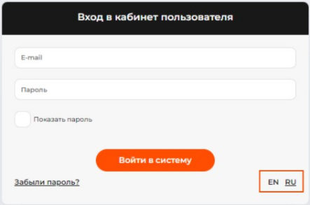 Для выбора языка интерфейса нажмите на буквенный код языка на странице входа в кабинет пользователя.