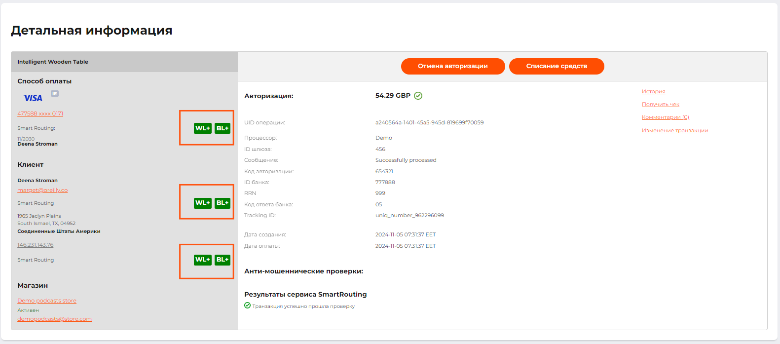На странице с детальной информацией о транзакции пользователи могут управлять данными в “черных” и “белых” списках по параметрам уже обработанных транзакций. Кнопки управления данных в списках расположены возле параметра, который может быть в “белом” или “черном” списке.