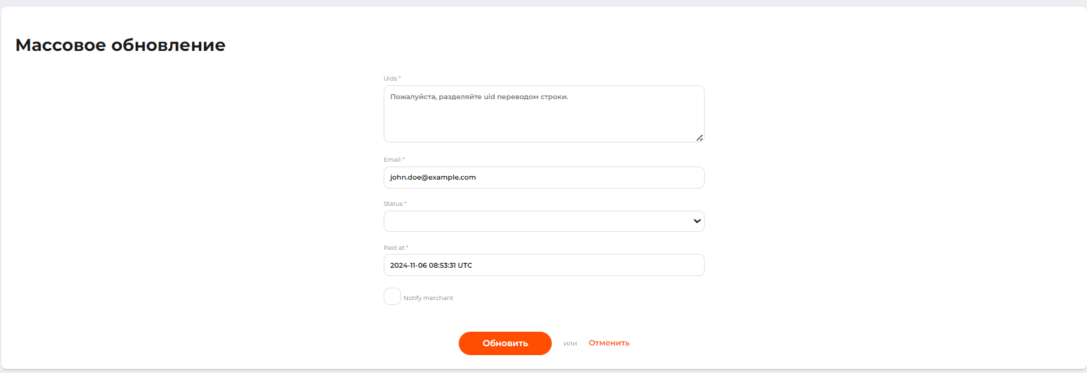 Пользователям с ролью “Поддержка” доступна опция массового обновления транзакций.
