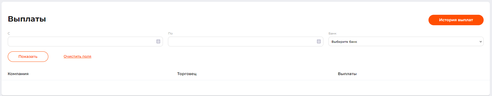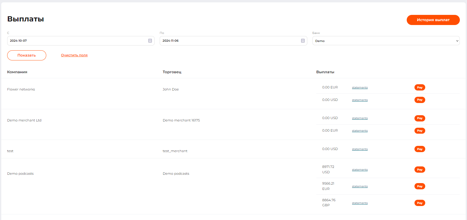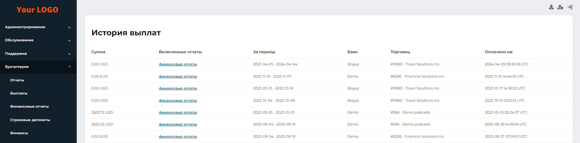 В личном кабинете системы под выплатами подразумевается проведение поставщиком платежных услуг банковского перевода средств на расчетные счета или карты торговцев. Суммы к выплате формируются на основе регулярных финансовых отчетов по результатам обработки транзакций в пользу торговца через определенный платежный шлюз для каждой валюты.