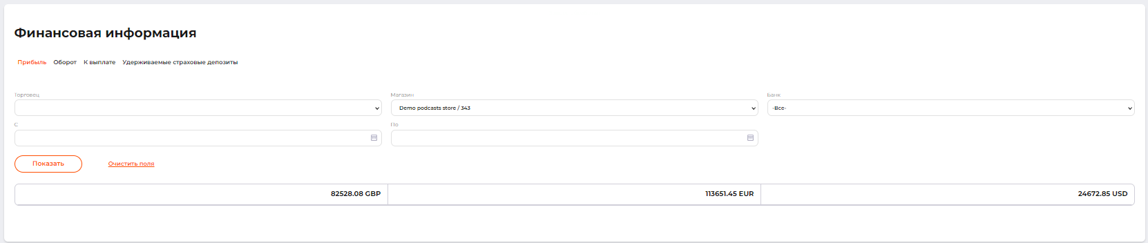 Прибыль считается как совокупная сумма дохода поставщика платежных услуг по всем финансовым отчетам, которые были сформированы в указанный период времени по указанным торговцам, магазинам и банкам. Суммирование происходит по каждой валюте транзакции отдельно.