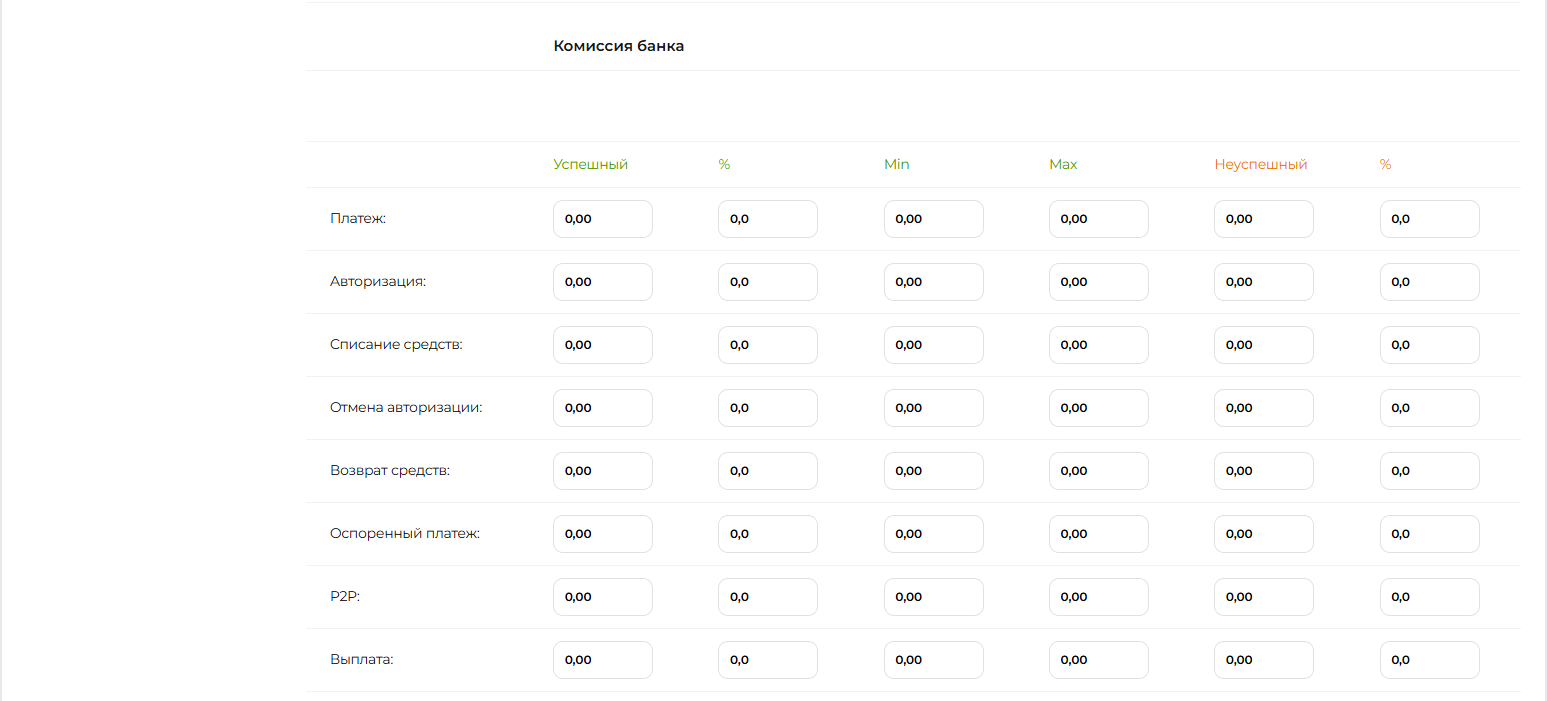 Успешный: фиксированная сумма, взимаемая за успешную транзакцию. %: процент от суммы, взимаемый за успешную транзакцию. Min: комиссия, которая будет применена вместо % ставки, если сумма, рассчитанная по процентной ставке, меньше указанной в этом поле. Max: комиссия, которая будет применена вместо % ставки, если сумма, рассчитанная по процентной ставке, больше указанной в этом поле. Неуспешный: фиксированная сумма, взимаемая за неуспешную транзакцию. %: процент от суммы, взимаемый за неуспешную транзакцию. |