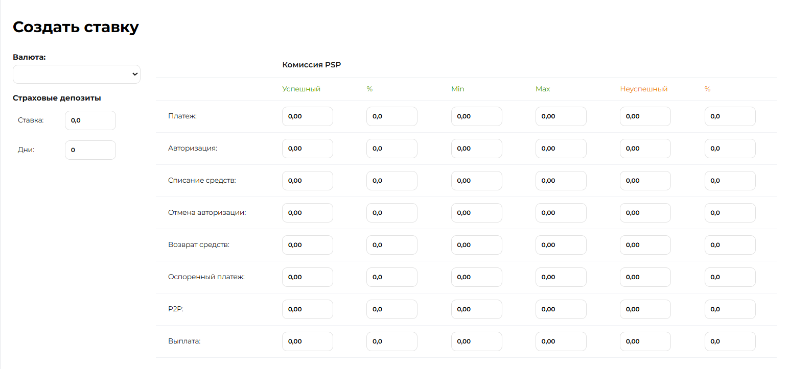 Отдельные формы для комиссий PSP и банка: комиссии PSP и банка (эквайера) настраиваются на отдельных формах на странице создания ставок.
