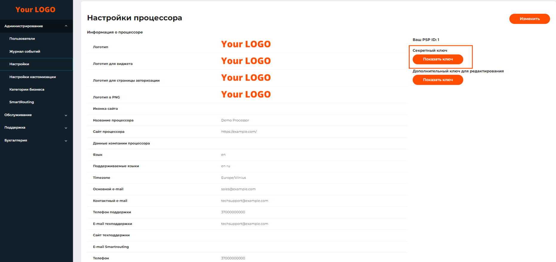 Перейдите на страницу Администрирование > Настройки. Идентификатор поставщика платежных услуг размещен рядом с информацией о процессоре (поставщике платежных услуг).