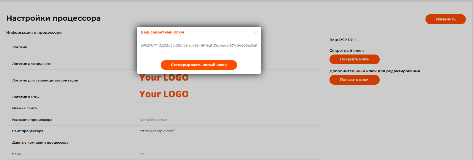 Нажмите Показать ключ для копирования секретного ключа или генерации нового, если вы подозреваете, что старый был скомпрометирован.