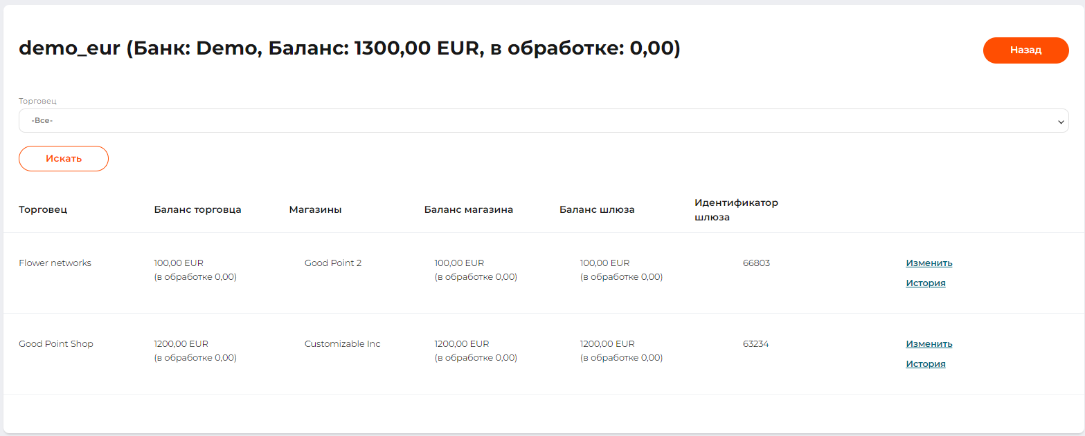 Панель отображения с суммами всех доступных балансов и транзакций в обработке с разделением по каждому торговцу, магазину и шлюзу, к которому подключен канал, в табличном виде.