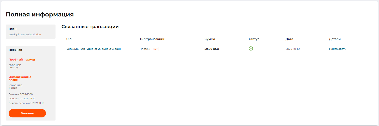 Система отобразит страницу с полной информацией о подписке, которая включает в себя следующие блоки: