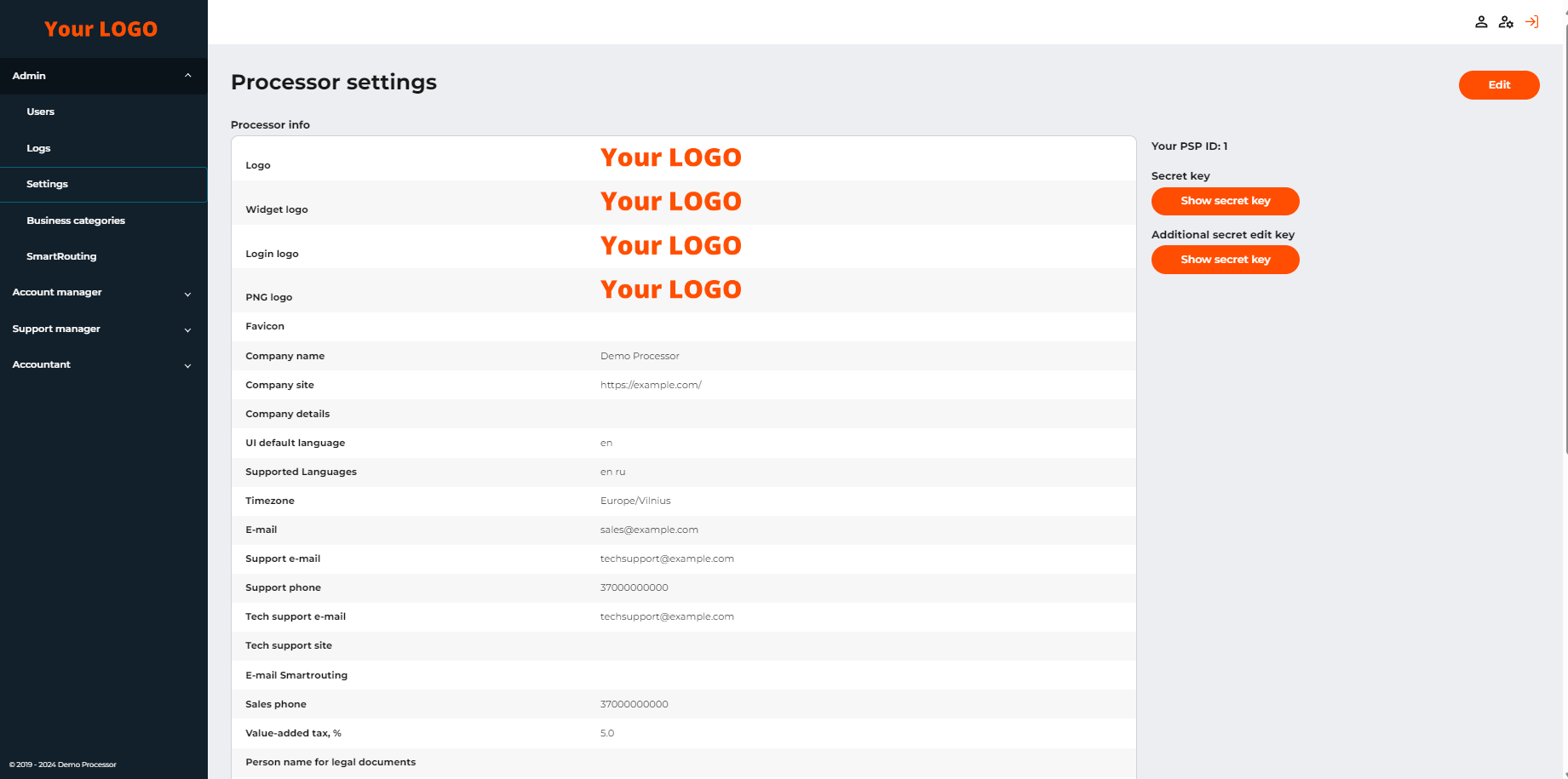 Отображается в пользовательском интерфейсе системы поставщика платежных услуг. При редактировании нажмите Выберите файл для загрузки логотипа. Активируйте чек-бокс Удалить логотип, чтобы оставить параметр пустым до загрузки нового логотипа. |