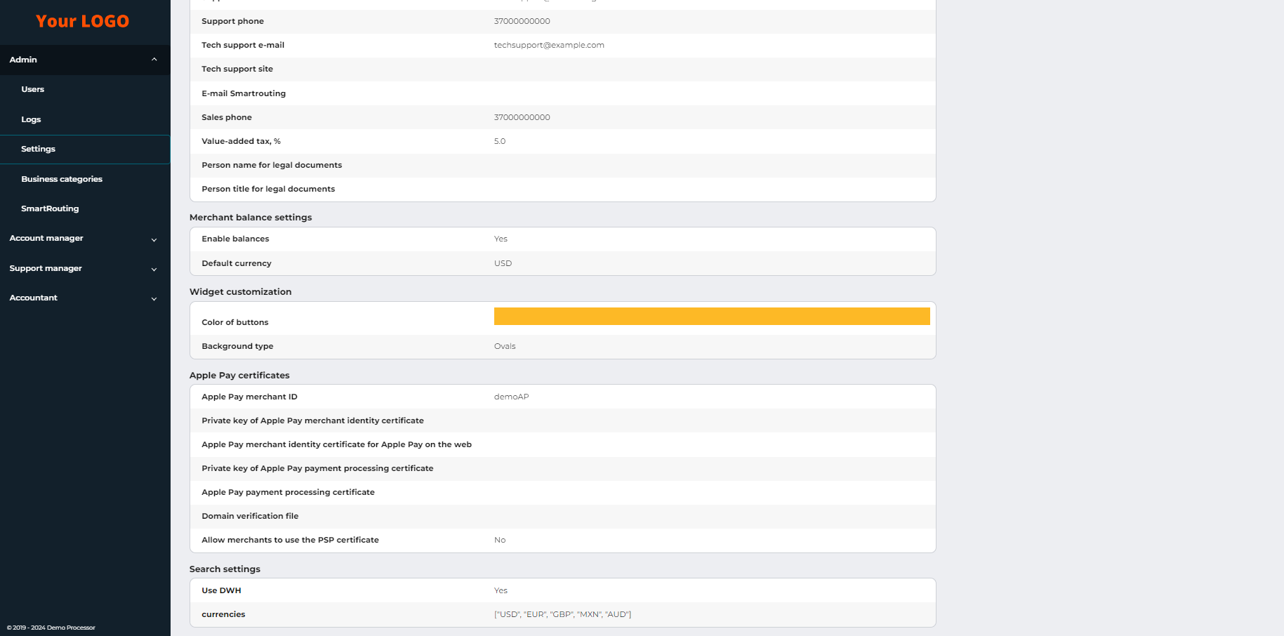 Для просмотра настроек системы для поставщика платежных услуг перейдите на страницу Администрирование > Настройки.