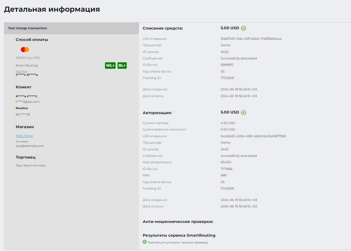 Детальная информация о транзакции представлена в виде следующих блоков. Пункты, обозначенные курсивом, недоступны для пользователей без разрешения Доступ к персональным данным: