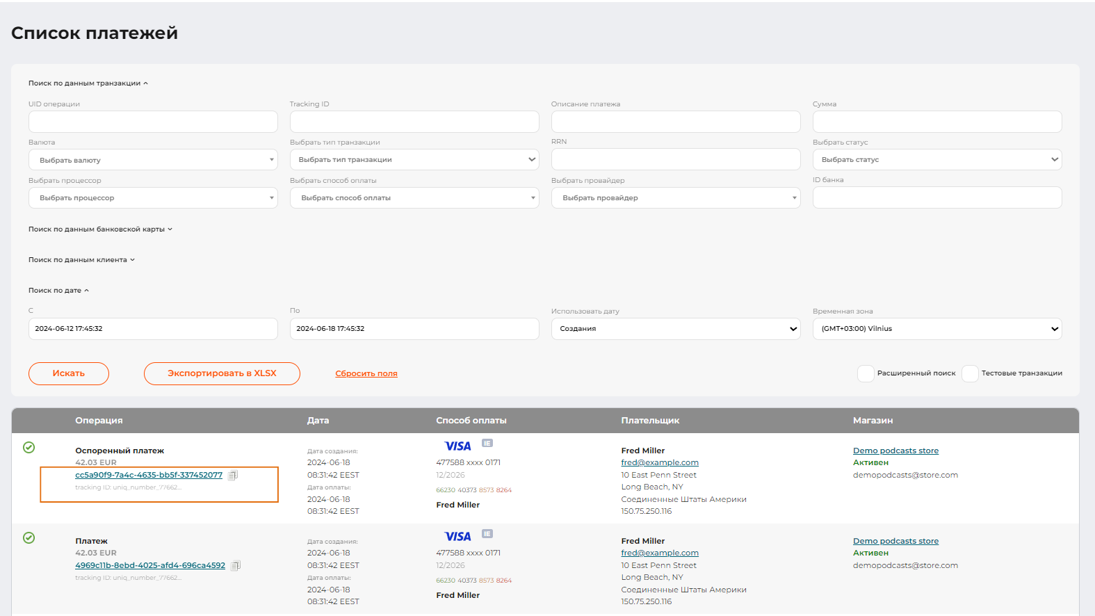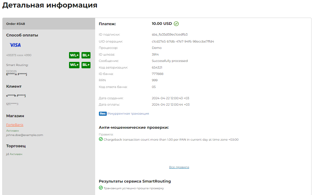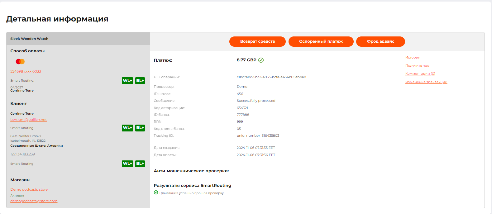 Рядом с номером карты покупателя, адресом электронной почты и IP-адресом также находятся кнопки управления данными в “белых” и “черных” списках. Больше информации можно найти в разделе Черные и белые списки покупателей.