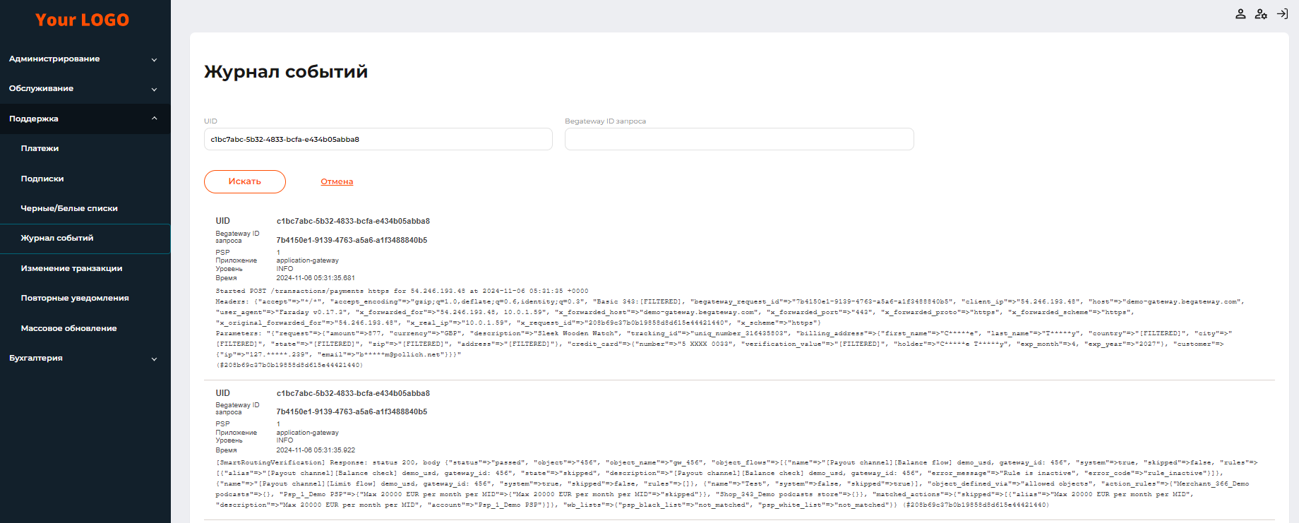 Пользователям с ролями “Администратор” и “Поддержка” доступен для просмотра журнал обработки транзакций, который содержит подробную информацию о запросах и времени их обработки разными компонентами системы.
