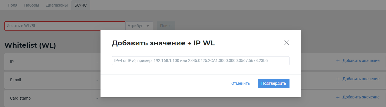 Чтобы добавить значение в белые/черные списки, выполните одно из следующих действий: