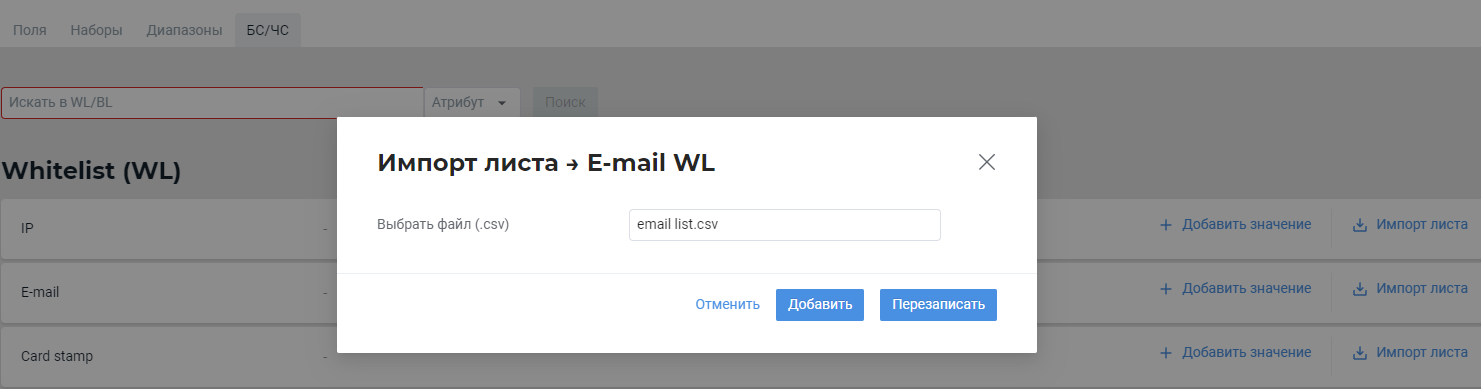 В открывшемся окне загрузите файл в формате CSV с вашего устройства. Далее нажмите кнопку Добавить, чтобы добавить импортируемые значения к уже существующим значениям атрибута или Перезаписать, чтобы при добавлении нового списка удалить ранее добавленные значения.