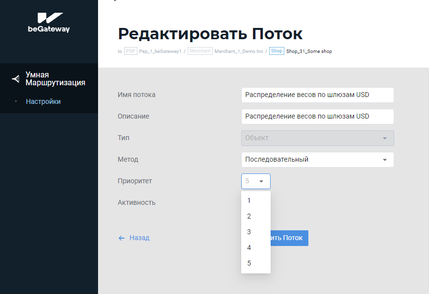 Создание/Редактирование потока с распределением транзакций по весам