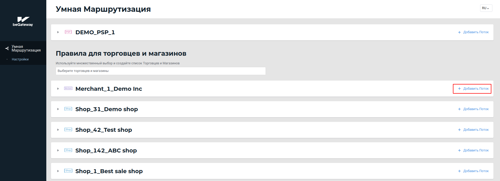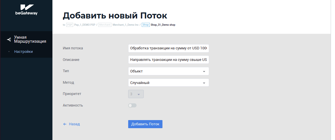 Пример: Создание нового потока для направления транзакции на сумму свыше USD 5000.00 на определенный шлюз